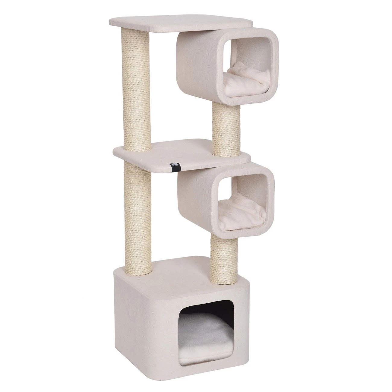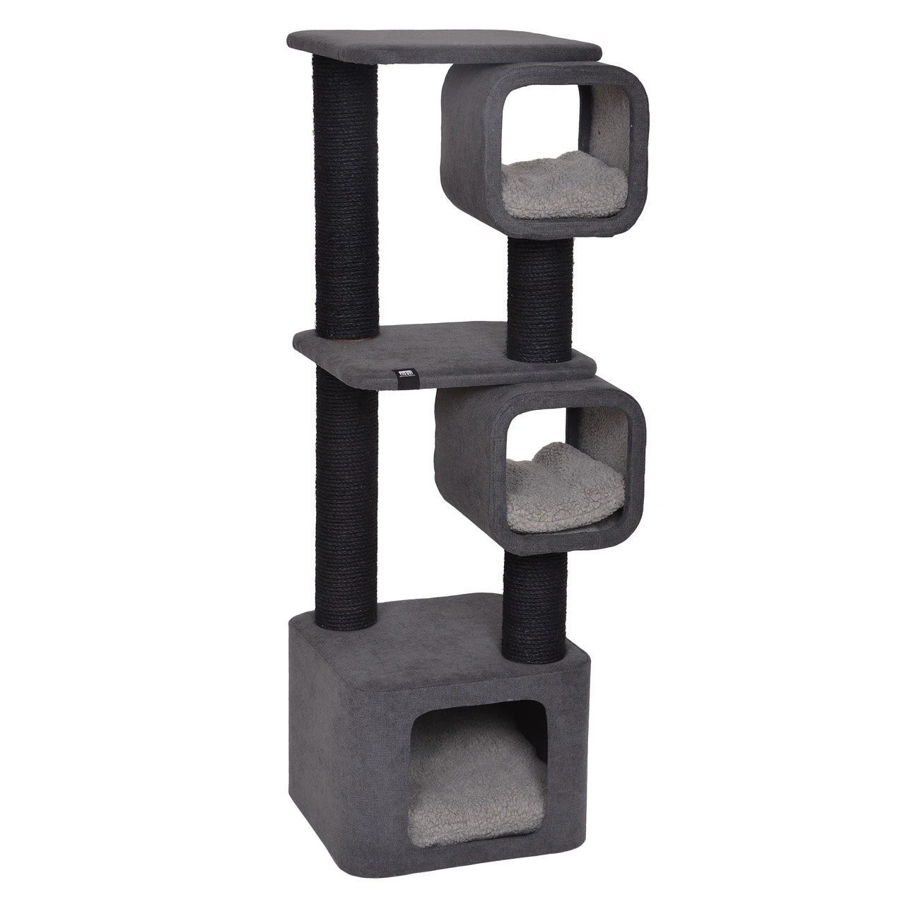 Der Kratzbaum Akita von ebi ist in einem schlichten Design gehalten und wurde inspiriert vom japanischen Zen-Konzept. Der minimalistische Kratzbaum ist mit Möbelstoff statt Plüsch bezogen und passt sich modernen Inneneinrichtigen harmonisch an. Zwei Röhren und eine Höhle bieten Unterschlupf zum Entspannen. Der Innenstoff ist mit einem angenehmen Schaum versehen und der Unterschlupf besitzt ein kuscheliges und weiches Plüsch-Kissen. Für Katzen ist es wichtig, dass der Kratzbaum aus hochwertigen Materialen gefertigt wurde, damit sie ihre Nägel pflegen und ihr Revier markieren können. Dank der sehr natürlichen und sehr robusten Faser Sisal kann die Katze problemlos die schuppige Deckschicht auf ihren Nägeln entfernen. Dies verhindert das Einwachsen der Nägel.