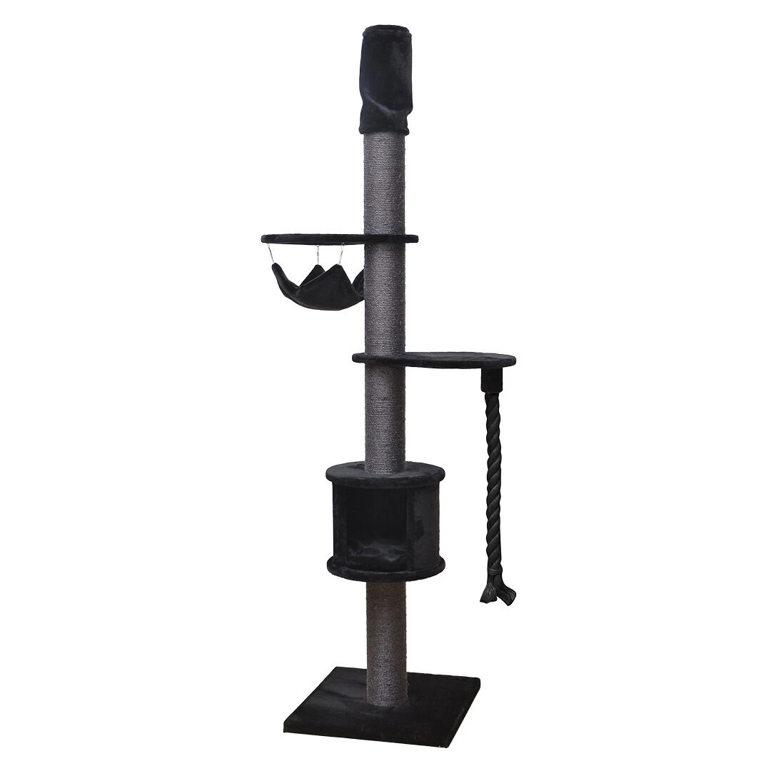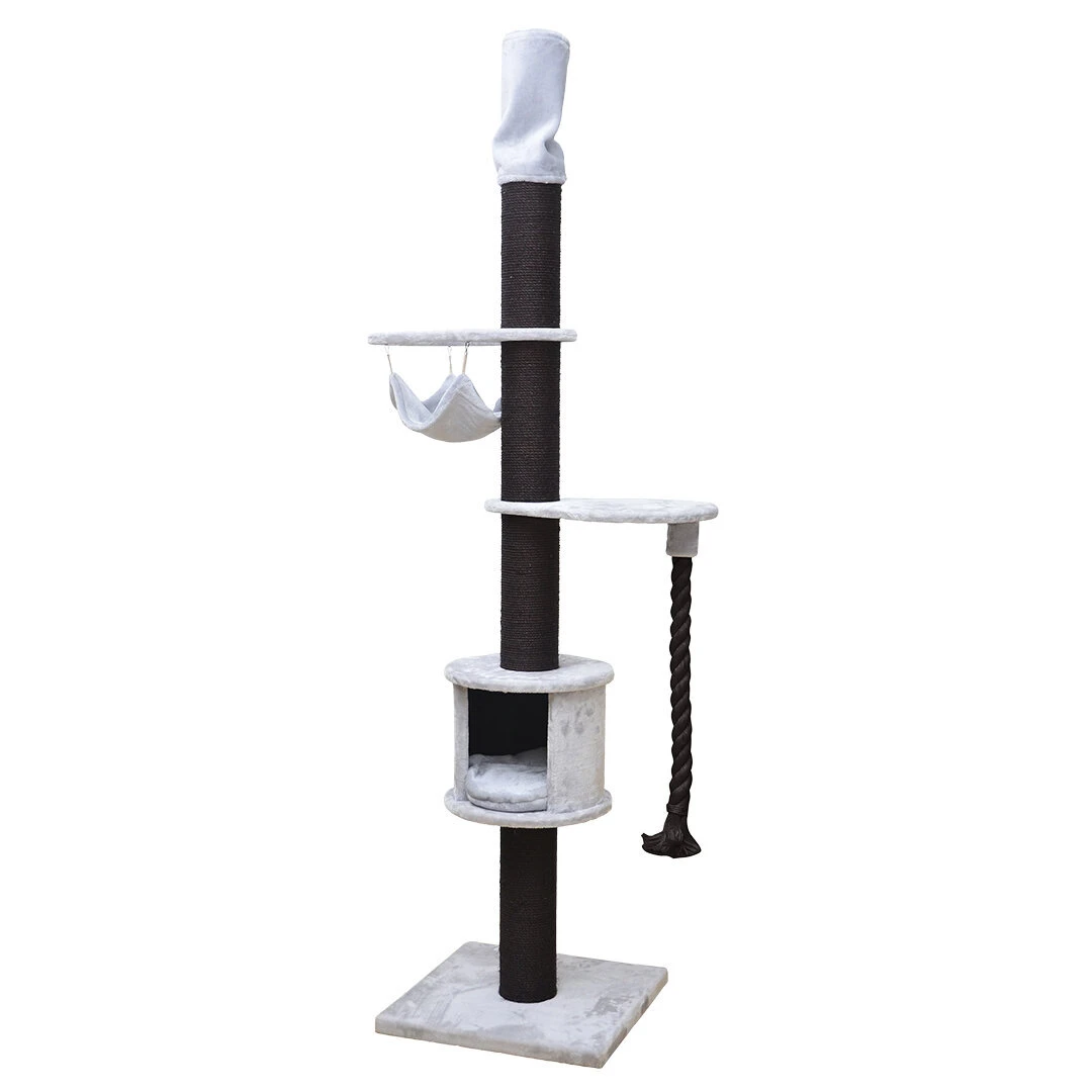 Der Kratzbaum Chester von EBI ist ein Kratzbaum aus Plüsch, den Sie mit Hilfe des praktischen Drehmechanismus in seinem oberen Teil zwischen Boden und Decke befestigen können. Die Höhe ist zwischen 220 und 245 cm verstellbar. Der Kratzbaum hat alles was sich eine Katze wünscht: er ist robust dank der Befestigung zwischen Boden und Decke, man kann bis zur Decke klettern, die Sisalpfähle sind bis zu 15 cm dick, es gibt eine komfortable Hütte, 2 Plattformen, eine Hängematte oben und eine dicke Spielkordel. Dank seiner hohen Konstruktion nimmt der Kratzbaum wenig Platz ein und ist ideal für große Katzen oder Familien mit mehreren Katzen.