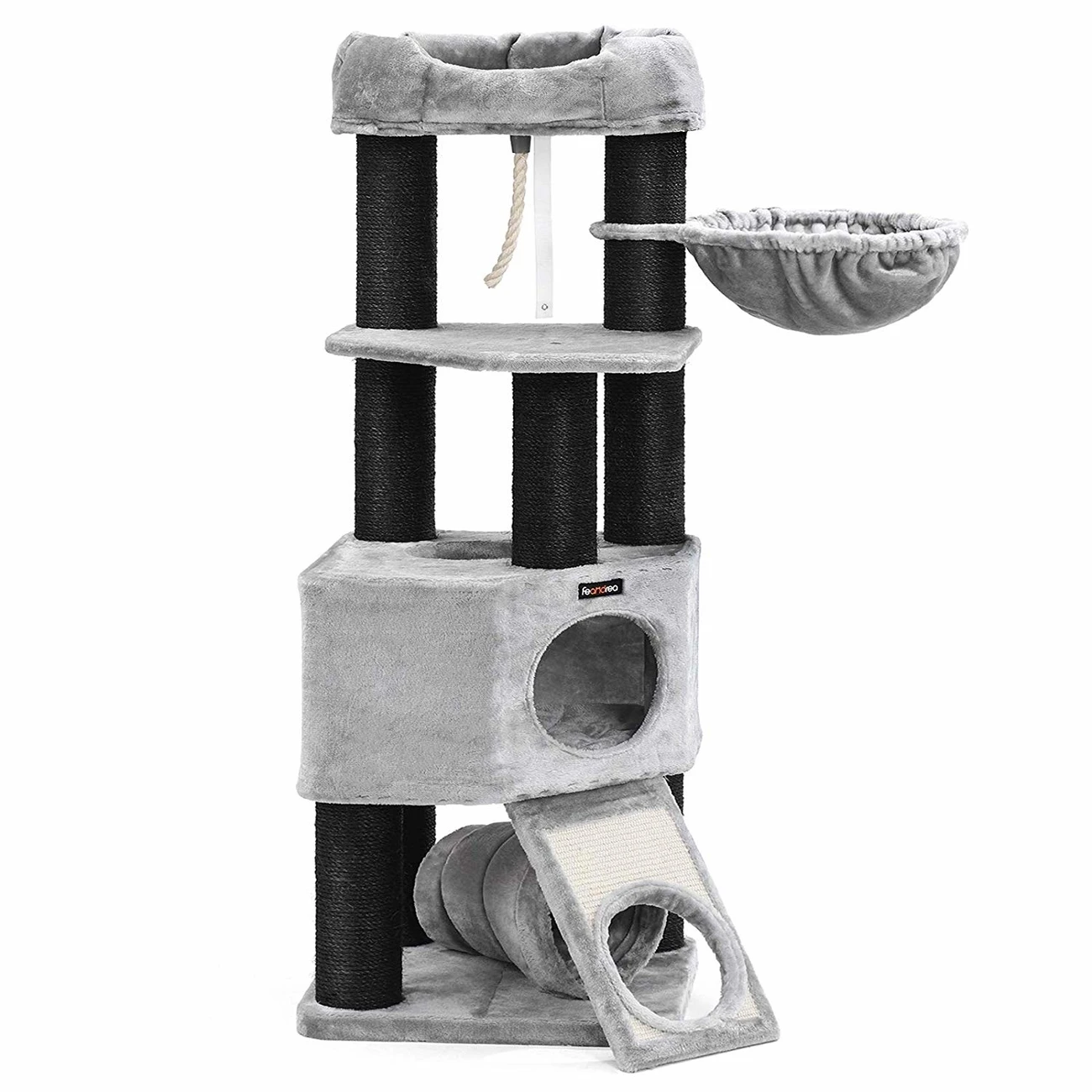 Großer Kratzbaum von FEANDREA by SONGMICS in grau. Der Kratzbaum ist ausgestattet mit einer plüschigen Aussichtsplattform, einer großen Höhle sowie einer gemütlichen Liegemulde. Neben komfortablen Ruheplätzen in den oberen Gefilden des Kratzbaumes befindet sich im unteren Bereich ein Katzen-Spielplatz mit einem Kratzbrett sowie einem Tunnel.
