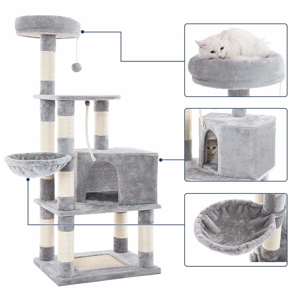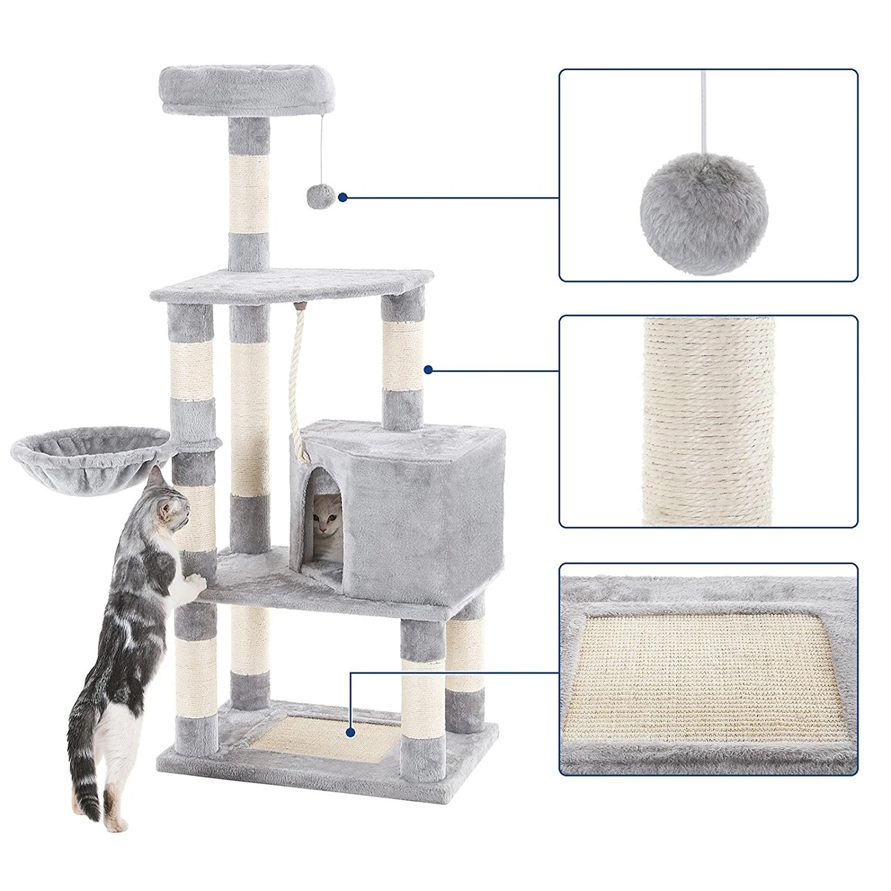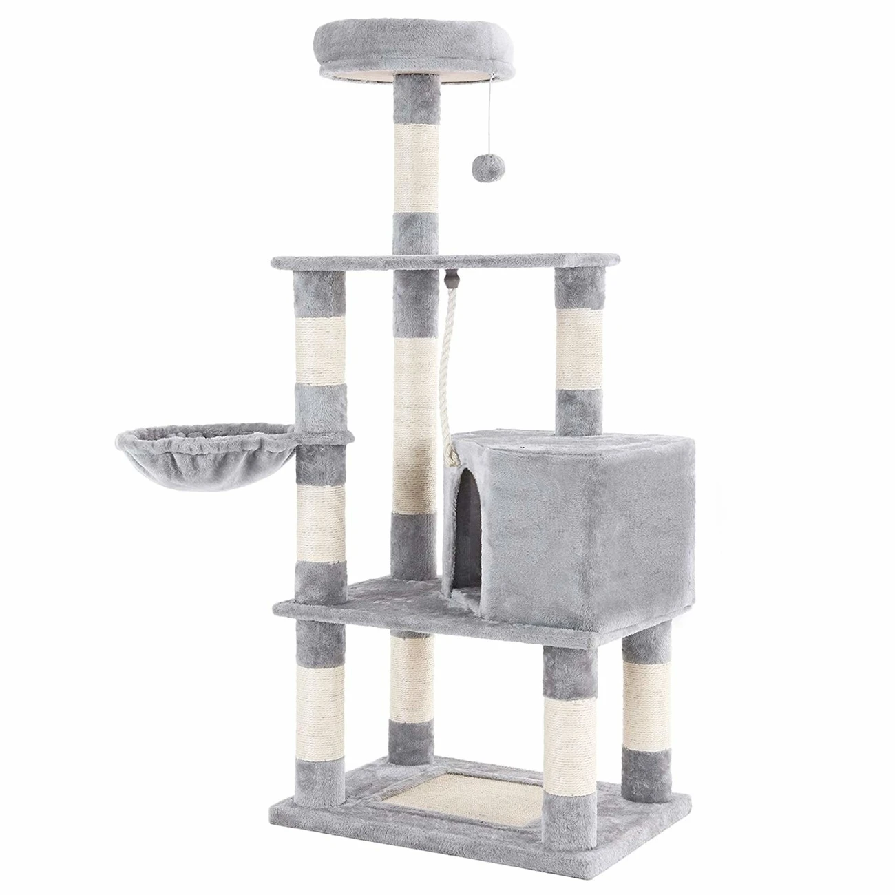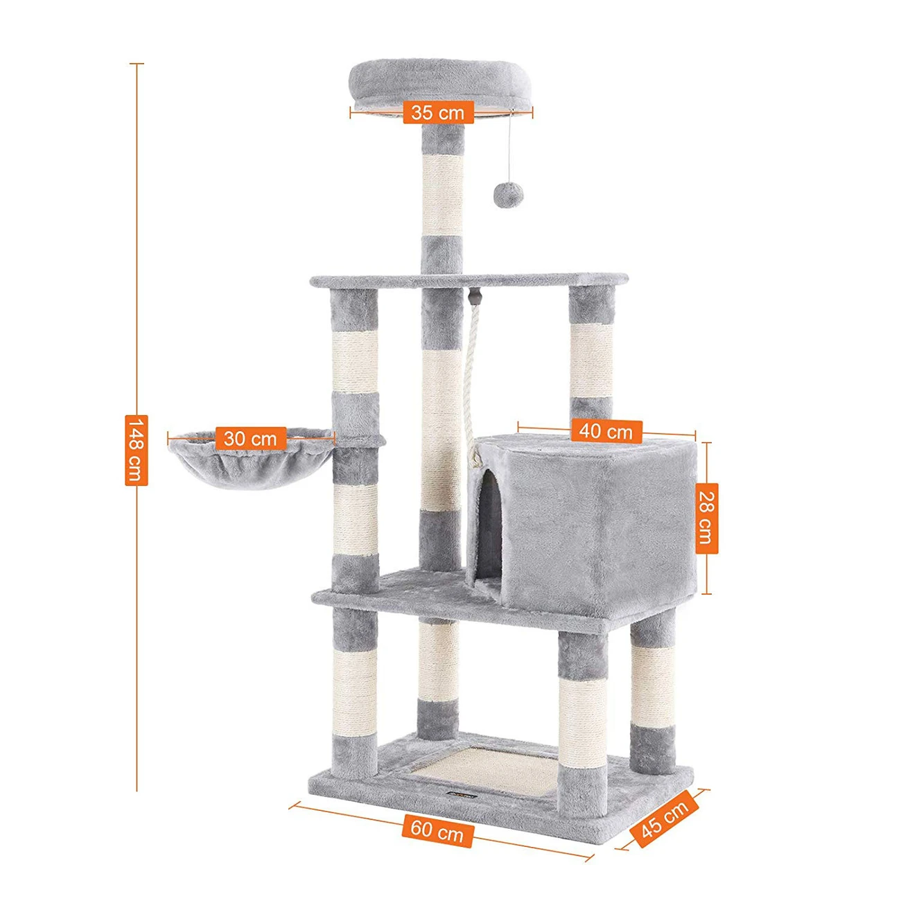 Die verschiedenen Ebenen bieten einen Spielplatz für Ihre Katze mit Kratzsäule sowie Kratzmatte mit Natursisal und Spielzeug. er Kratzbaum ist aus CARB-zertifizierten Brettern und mit weichem Plüsch überzogen. Mit einer Höhe von 148 cm ist der Spielbaum in einer katzenfreundlichen Höhe zum Spielen und Liegen. Mit 75 x 45 cm (BxT) bietet er viel Platz für Katzen und passt in jeden Raum.