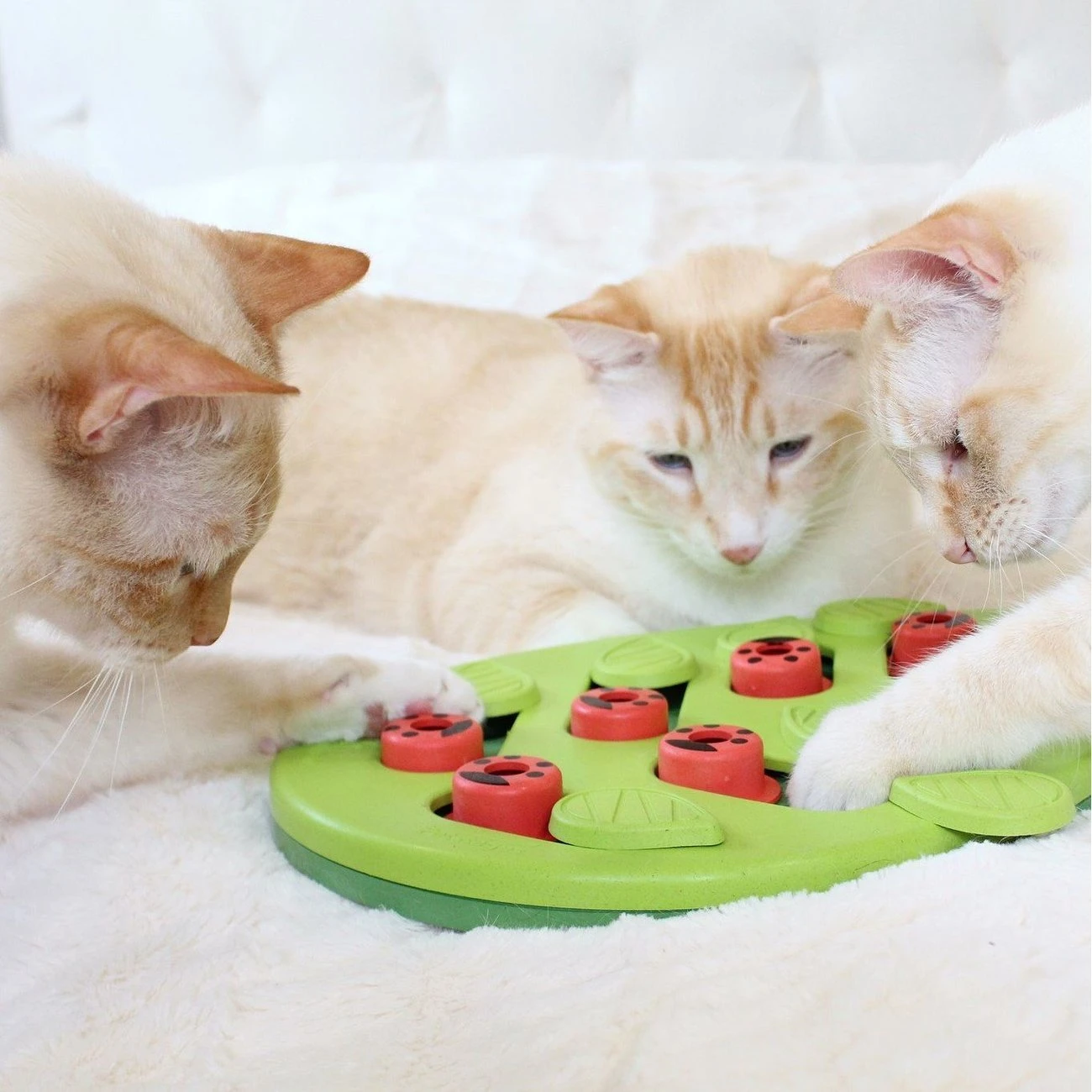 Das Katzenspiel fordert die Aufmerksamkeit der Katze und funktioniert ganz einfach. Um zu spielen werden zunächst die verschiedenen Fächer mit Snacks befüllt. Außerdem kann auch die tägliche Ration Trockenfutter in das Spiel gefüllt werden, um das tägliche Fressen zu variieren.