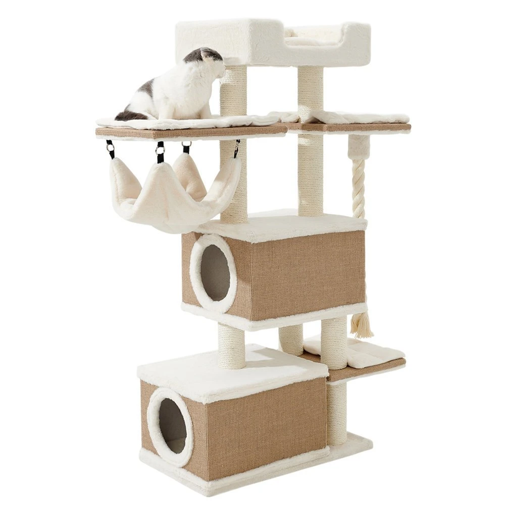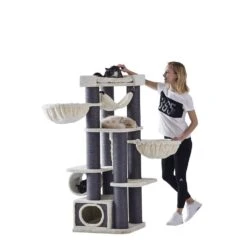 Der Kratzbaum Comet von Nobby steht auf einer Grundfläche von 70 x 40 cm und ist 145 cm hoch. Er ist ausgestattet mit Ø 9 cm Sisalstämmen, verschiedenen Liegeflächen, zwei Kuschelhöhlen sowie einer Mulde.