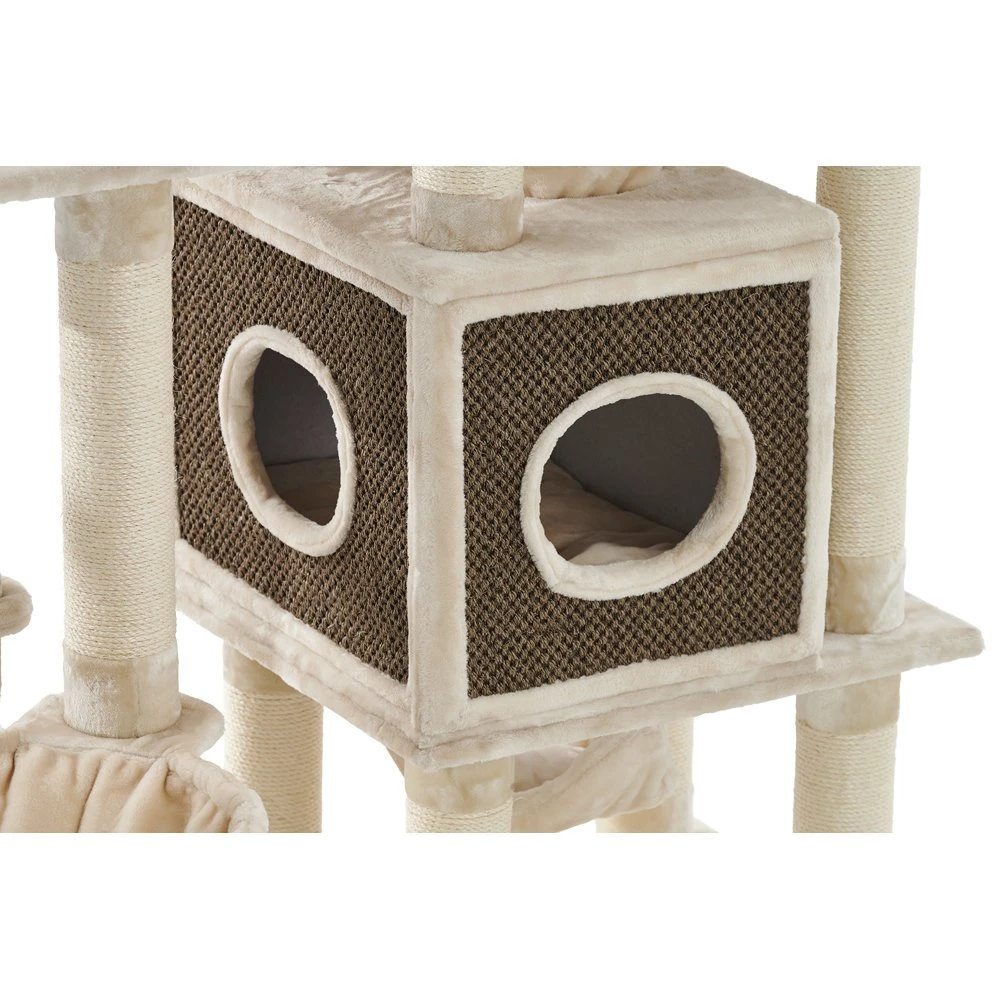 Der große Kratzbaum Gadi von Nobby steht auf einer Grundfläche von 110 x 60 cm und ist 198 cm hoch. Die Kratzstämme bestehen aus Sisal (Ø 11 cm). Der Kratzbaum ist mit einer großen Höhle und mit mehreren Liegeflächen, Liegemulden, Hängematten und Spielseilen (50 + 60 cm) ausgestattet