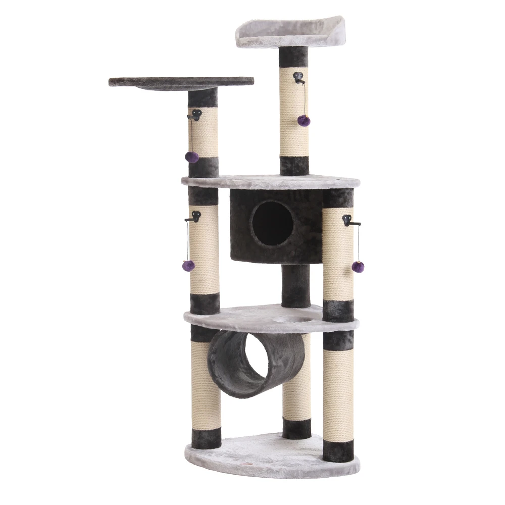 Der Nobby Kratzbaum Santos Plus ist 1,68 m hoch und hat eine Grundfläche von 70 x 55 cm. Die Sisalstämme sind mit anthrazitfarbenem Plüsch verziert und haben einen Durchmesser von 12 cm. Zudem ist er mit mehreren Liegeflächen, einer Höhle, einer Röhre und Spielzeugen an Gummibändern ausgestattet.