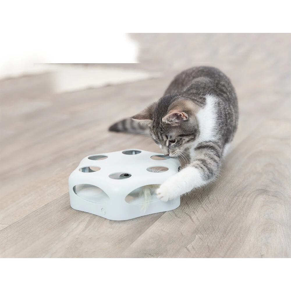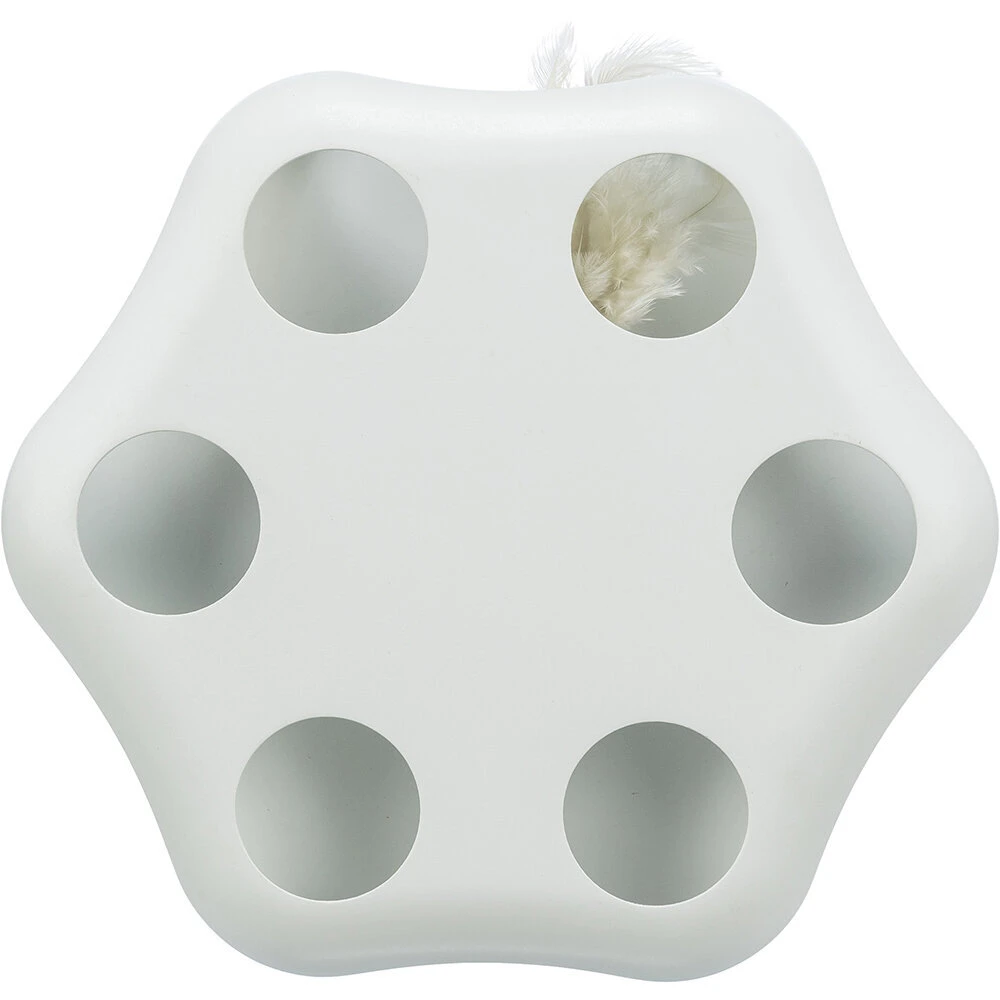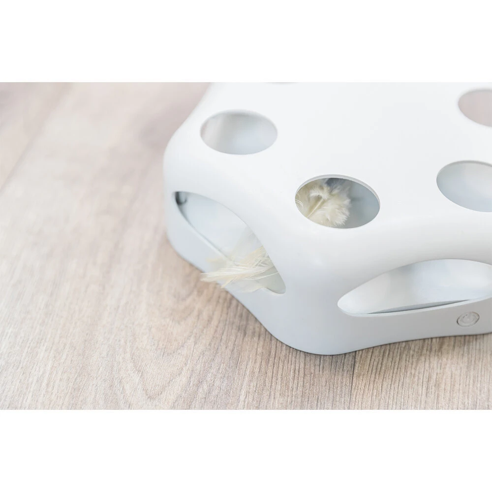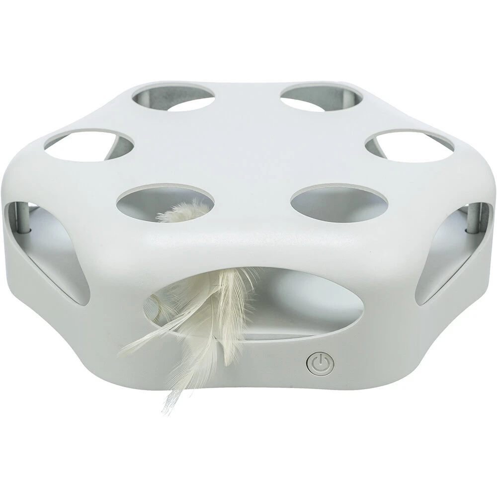 In dem Katzenspielzeug Turning Feather von Trixie wirbelt eine Feder im Inneren herum, stoppt und wechselt unregelmäßig die Richtung, somit weckt es den Jagdinstinkt der Katze und bietet eine artgerechte Beschäftigung. Zusätzlich kann das Katzenspielzeug mit Leckerlis befüllt werden, um eine zusätzliche Motivation zu bieten.