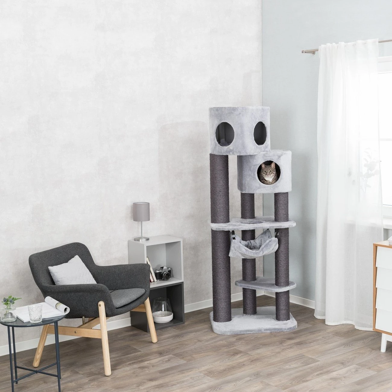 Dieser Kratzbaum von TRIXIE trägt den Namen „Pirro“ und ist ein wahres Spielparadies für Katzen und Kater. Der Kratzbaum verfügt über zwei Höhlen in die sich der Stubentiger entspannt zurückziehen kann, ohne den Überblick über sein Reich zu verlieren. Außerdem sorgt eine Hängematte für gemütliche Stunden zum entspannen. Die Stämme des Kratzbaumes sind allesamt mit Sisal umwickelt, damit der Kater oder die Katze sich ausgiebig um die eigene Krallenpflege kümmern kann und sich die Krallen daran wetzen kann.
