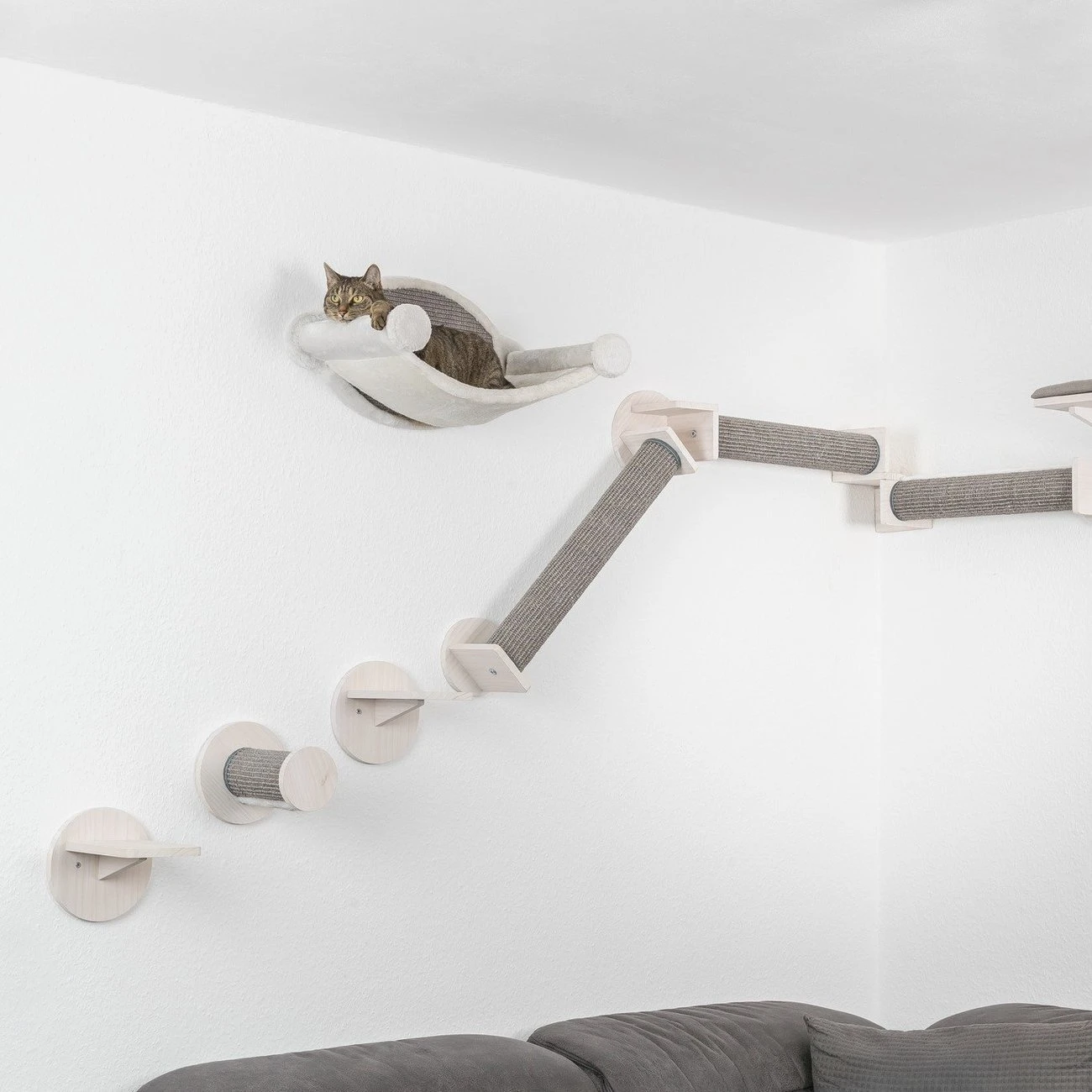 Das Wand Set mit drei Stufen eignet sich perfekt für eine vielfältige Kletterlandschaft. Die Stufen können in beliebiger Höhe und Entfernung voneinander befestigt werden und helfen der Katze, höher gelegene Plätze zu erreichen. Durch den robusten Sisal können außerdem die Krallen geschärft werden.