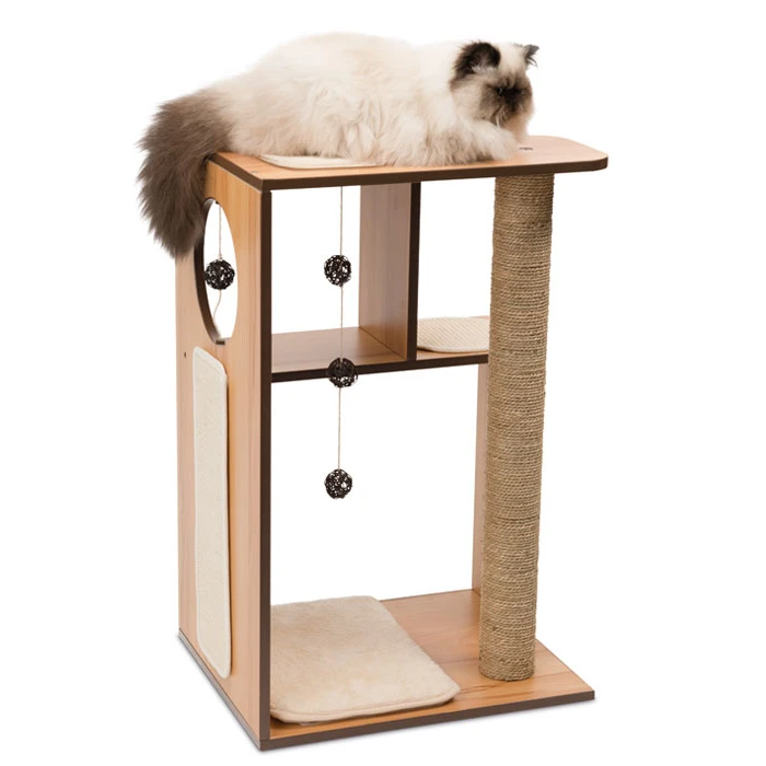 Die V-BOX large ist unsere kompakte Erlebniswelt für Katzen. Mehrere Ebenen und Liegefl ächen bieten Gelegenheit zum Relaxen und Spielen, während die lange Kratzsäule und -fl äche zum genüsslichen Krallenwetzen einladen.
